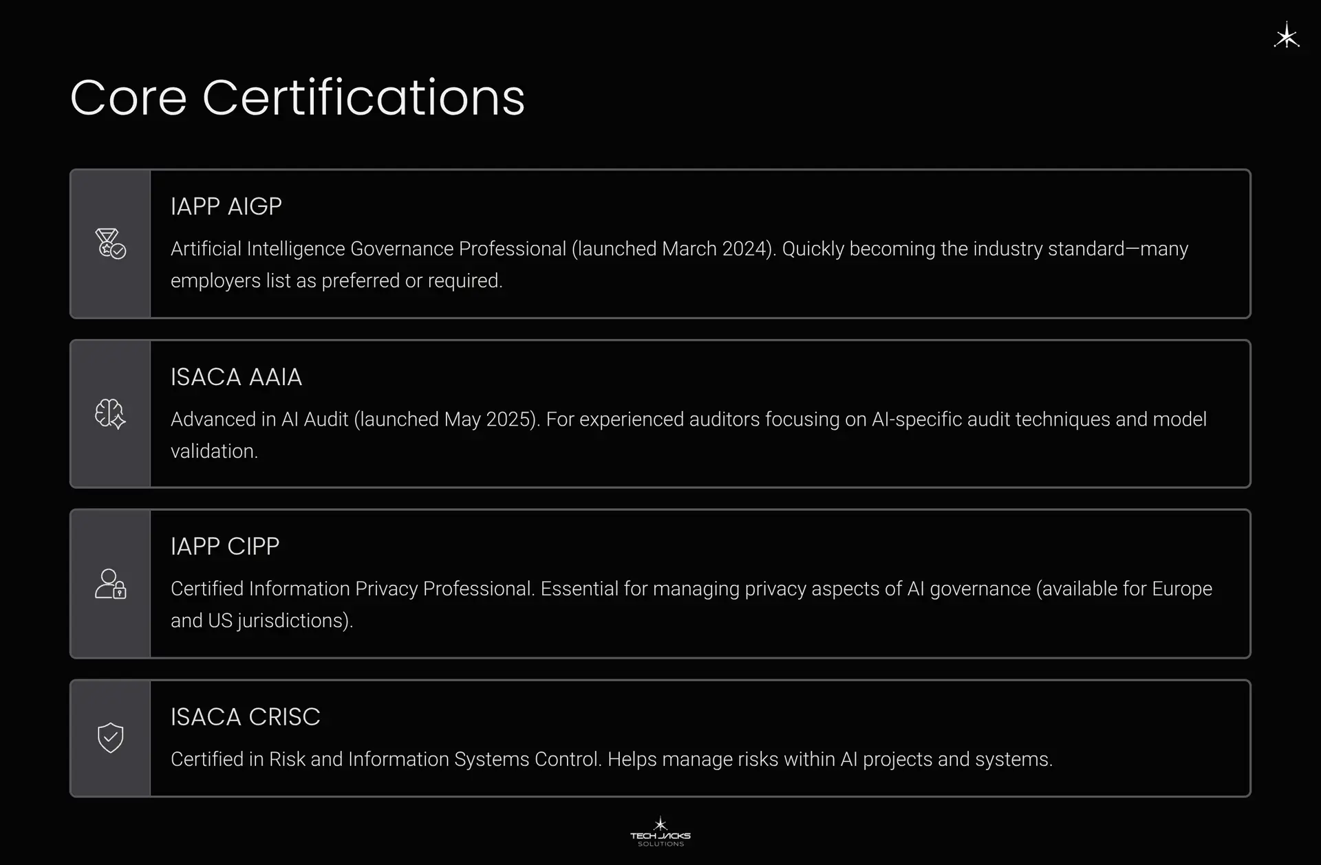 ISACA AAIA (Advanced in AI Audit): Launched in May 2025 for experienced auditors. Focuses on AI-specific audit techniques, model validation, and assurance practices.