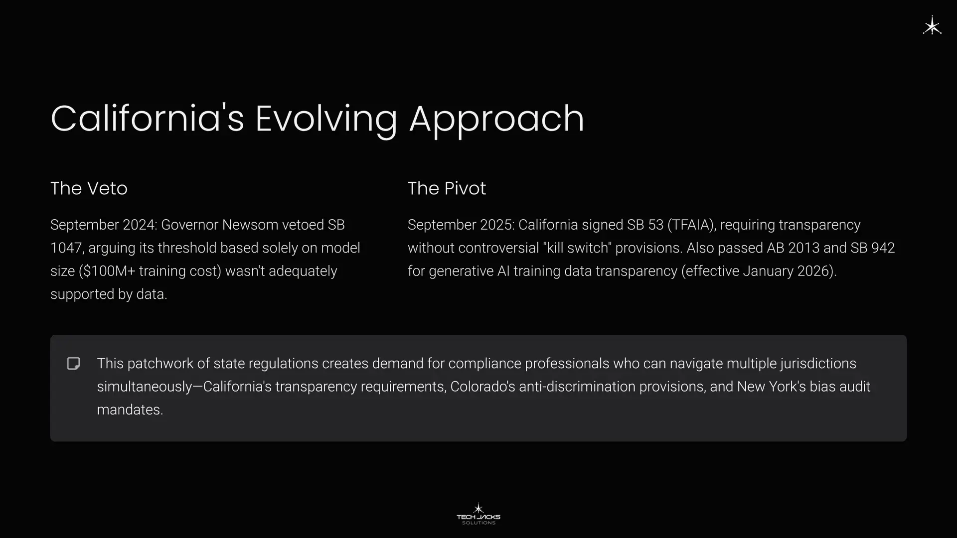 California’s approach to AI regulation evolved significantly in 2024 and 2025. In September 2024, Governor Gavin Newsom vetoed SB 1047 (the Safe and Secure Innovation for Frontier Artificial Intelligence Models Act), which would have imposed safety requirements on developers of large AI models costing over $100 million to train. Newsom argued that the bill’s threshold based solely on model size was not adequately supported by data.