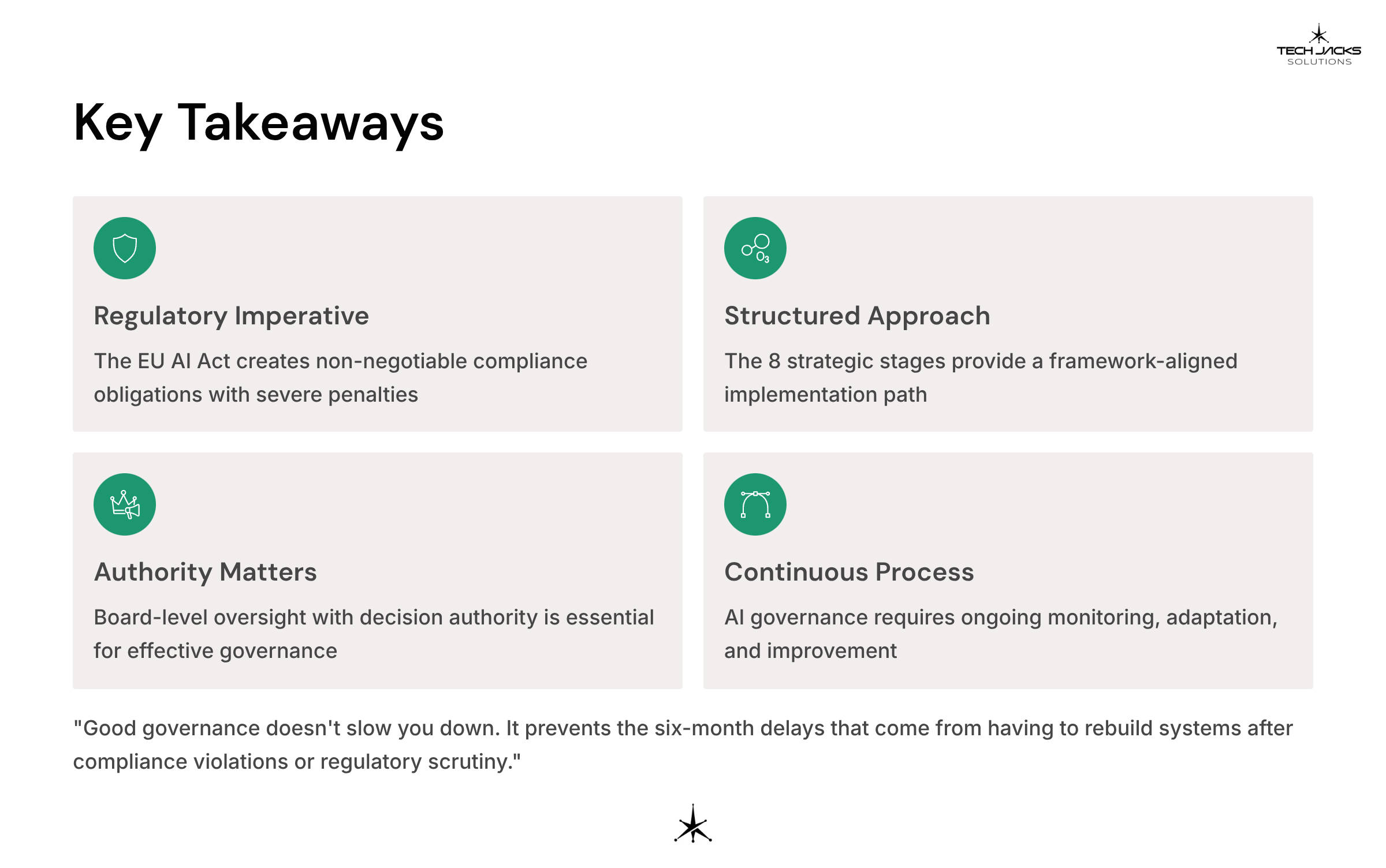 Good governance doesn’t slow you down. It prevents the six-month delays that come from having to rebuild systems after compliance violations or regulatory scrutiny.