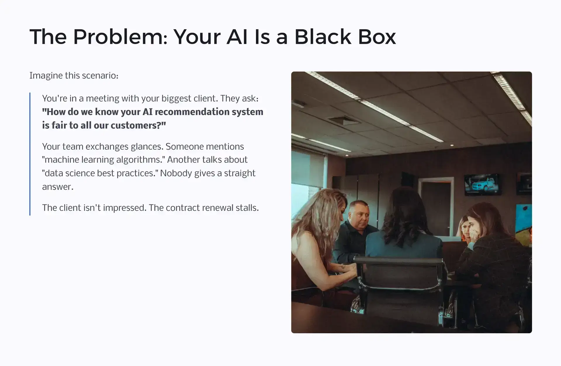 [Hypothetical scenario for illustration]: You’re in a meeting with your biggest client. They ask a simple question about your AI recommendation system: “How do we know it’s fair to all our customers?”