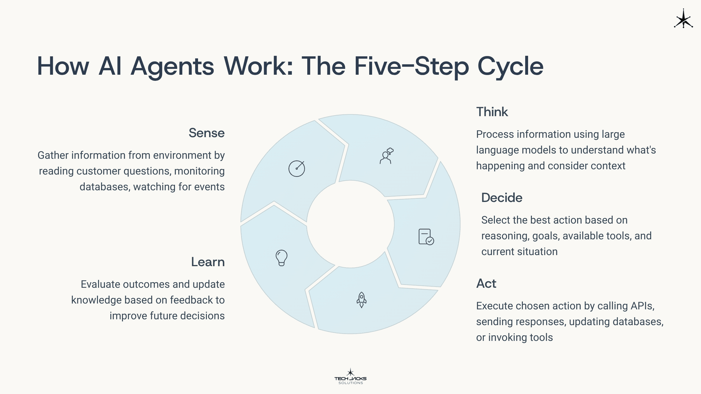 Sense. The agent gathers information from its environment by reading customer questions, monitoring databases, watching for events, or pulling data from APIs.