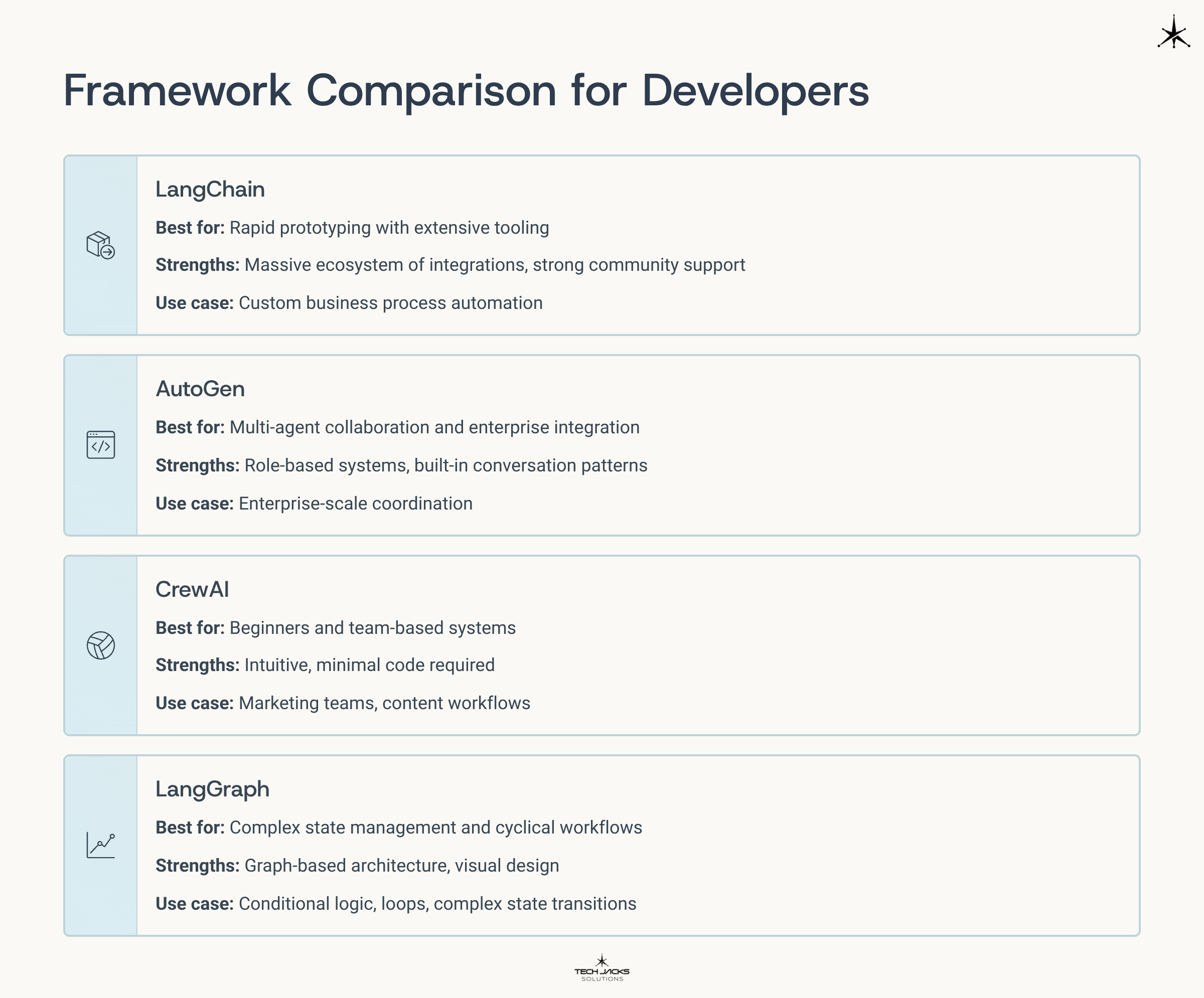 Choose based on your use case. LangChain excels for prototyping and applications needing extensive tool integrations. AutoGen works best for enterprise environments requiring multi-agent collaboration with strong governance. CrewAI suits beginners and non-technical users who want role-based agent teams. LangGraph handles complex workflows needing sophisticated state management. Start with CrewAI for simplicity, LangChain for flexibility, or AutoGen for enterprise scale.