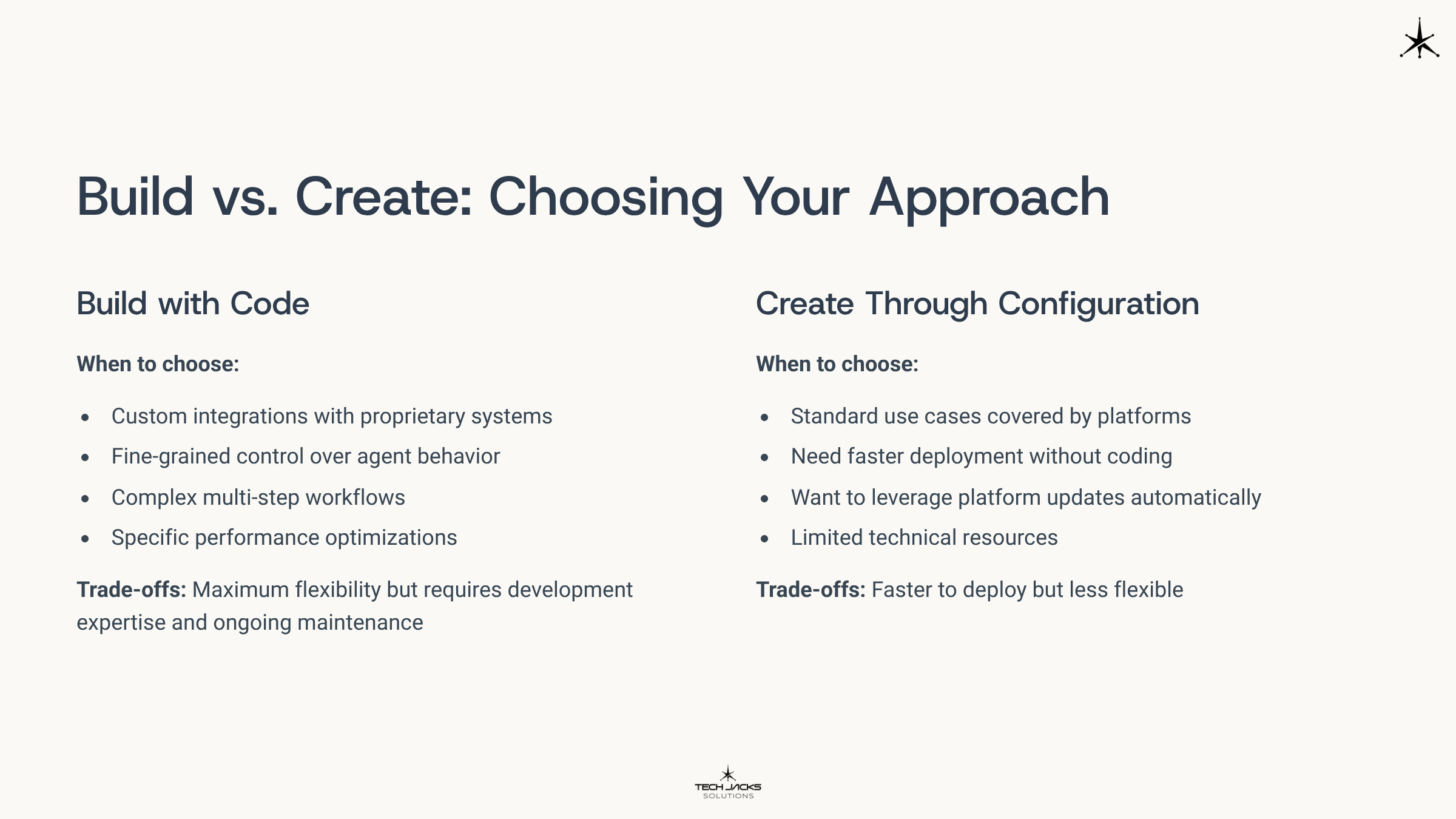 Create through configuration when you have standard use cases covered by existing platforms, need faster deployment without coding, want to leverage platform updates automatically, or have limited technical resources. This approach is faster to deploy but less flexible.