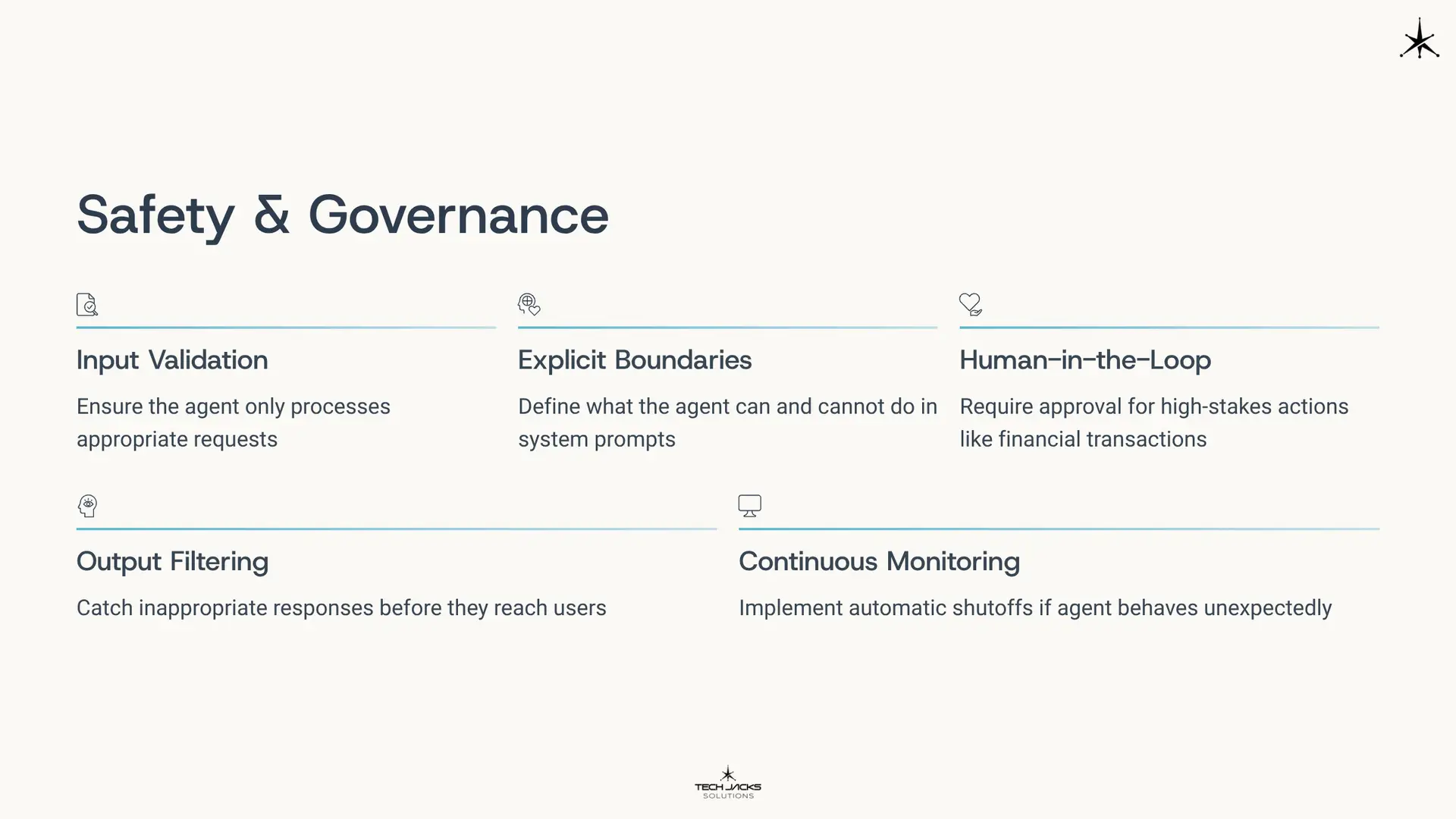 Give clear instructions with specific, measurable goals. Don’t say “help with marketing.” Say “draft three social media posts highlighting our new feature, each under 280 characters, targeting small business owners.” Iterate by starting simple then adding complexity. Implement human-in-the-loop review for critical decisions. Provide feedback that helps agents learn.