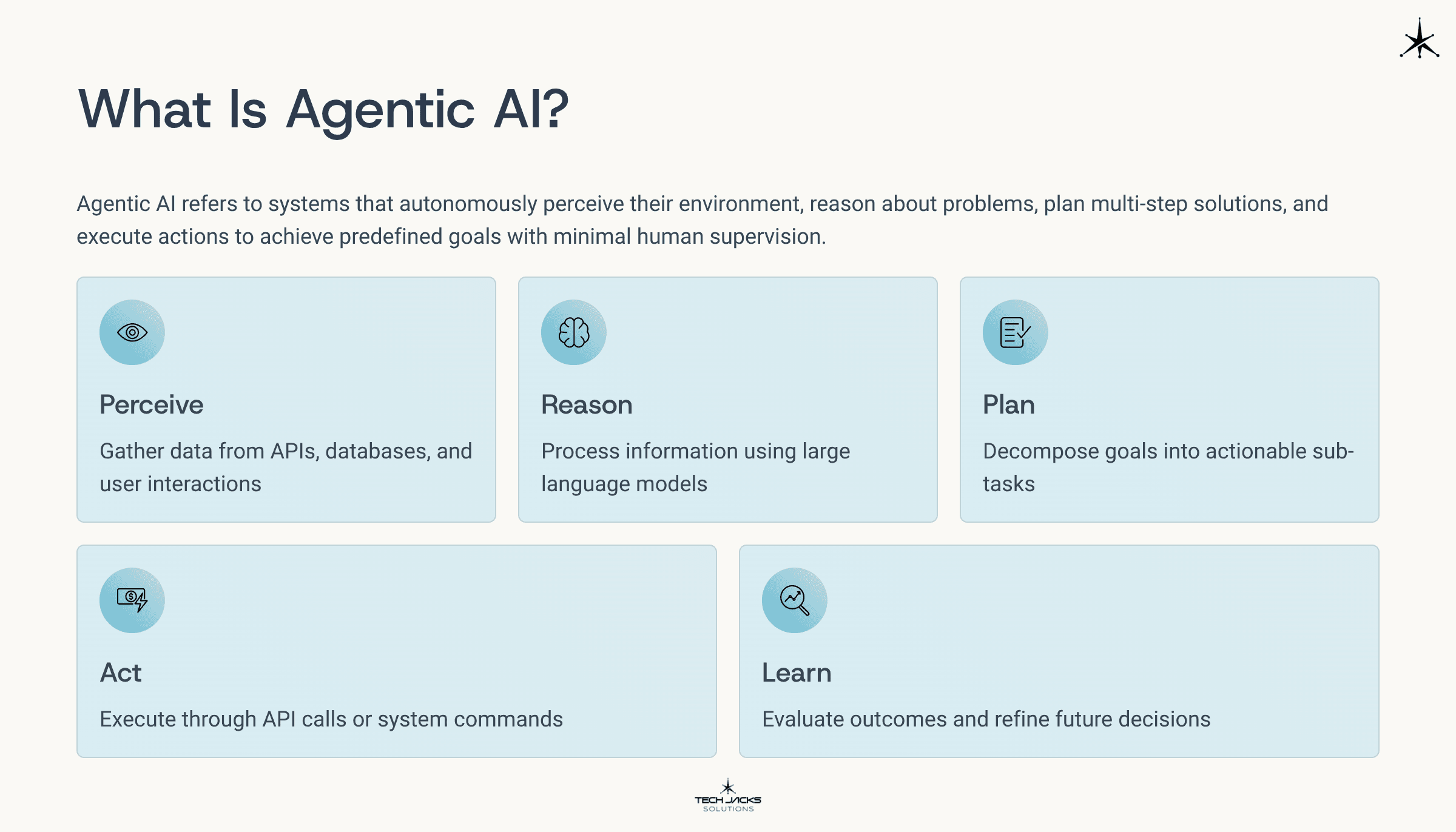 Learn. The agent evaluates outcomes. Did the action achieve the intended result? It updates knowledge based on feedback, improving future decisions.