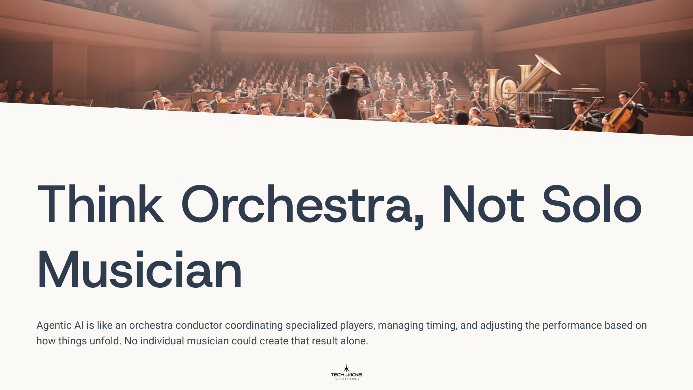 Think of agentic AI as an orchestra conductor, not a single musician. The conductor coordinates specialized players, manages timing, adjusts the performance based on how things unfold. No individual musician could create that result alone.