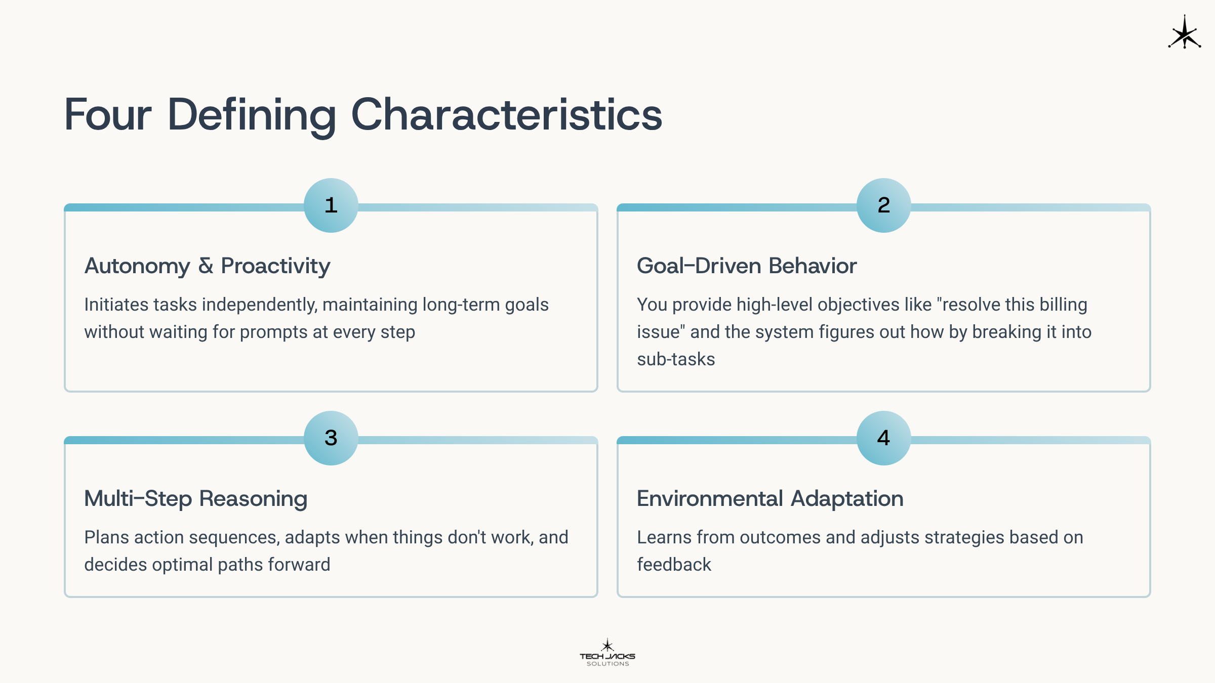 Four characteristics define these systems. Autonomy and proactivity mean they initiate tasks independently, maintaining long-term goals without waiting for prompts at every step. Goal-driven behavior means you provide high-level objectives like “resolve this billing issue” and the system figures out how by breaking it into sub-tasks. Multi-step reasoning allows planning action sequences, adapting when things don’t work, and deciding optimal paths forward. Environmental adaptation means learning from outcomes and adjusting strategies based on feedback.