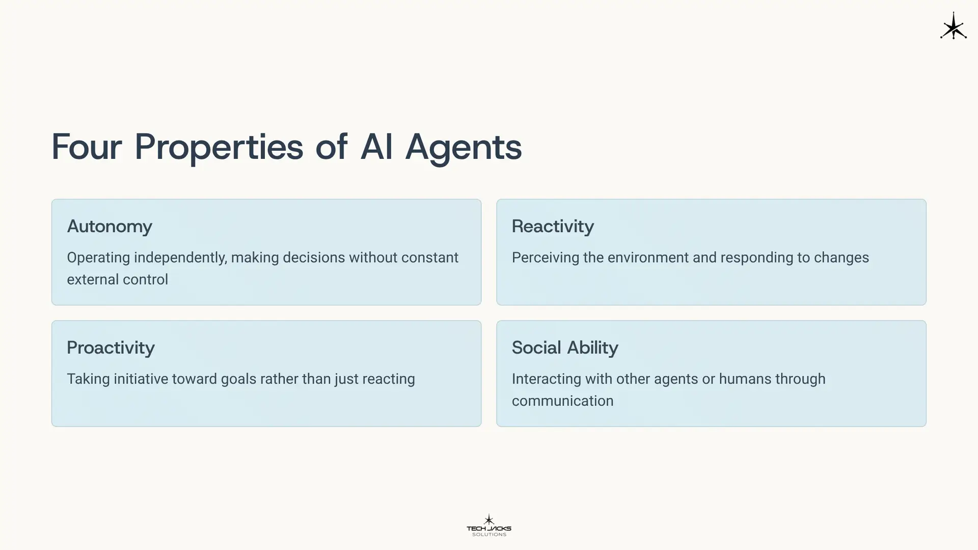 Four properties distinguish agents from regular programs. Autonomy means operating independently, making decisions without constant external control. Reactivity means perceiving the environment and responding to changes. Proactivity means taking initiative toward goals rather than just reacting. Social ability means interacting with other agents or humans through communication.