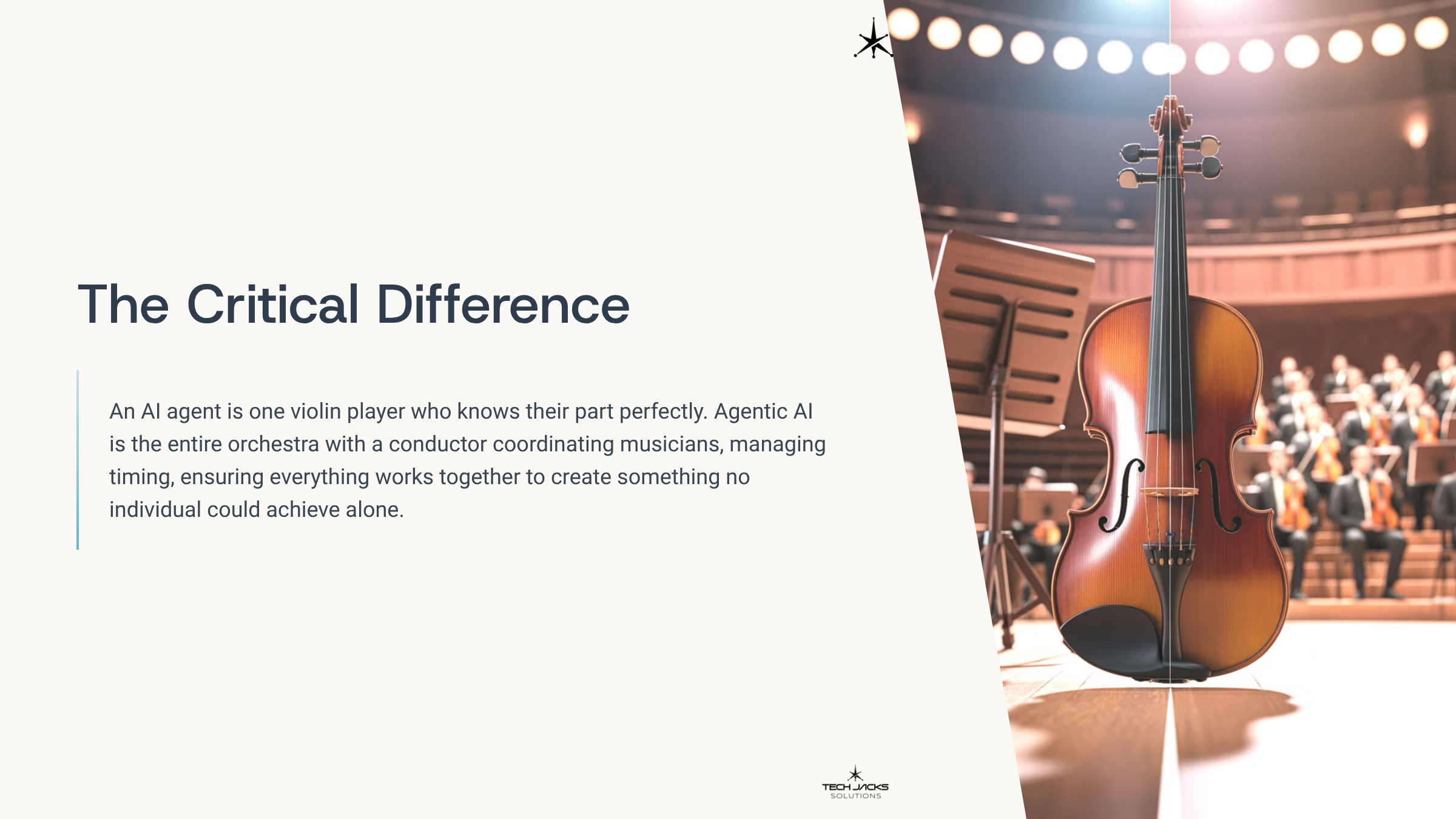For beginners, think of it this way. An AI agent is one violin player who knows their part perfectly. Agentic AI is the entire orchestra with a conductor coordinating musicians, managing timing, ensuring everything works together to create something no individual could achieve alone.