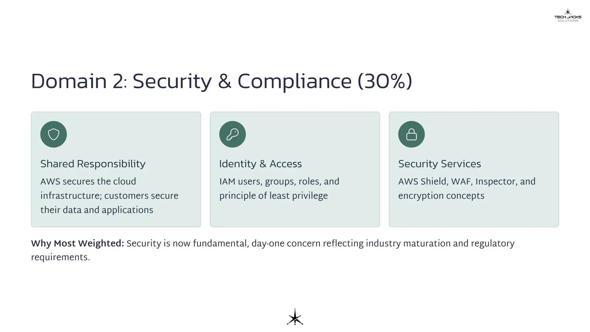 Why the Weight Increase: The 5% increase from CLF-C01 reflects industry maturation. High-profile data breaches, complex regulatory landscapes (GDPR, HIPAA), and robust governance needs have elevated security from advanced topic to fundamental, day-one concern.
