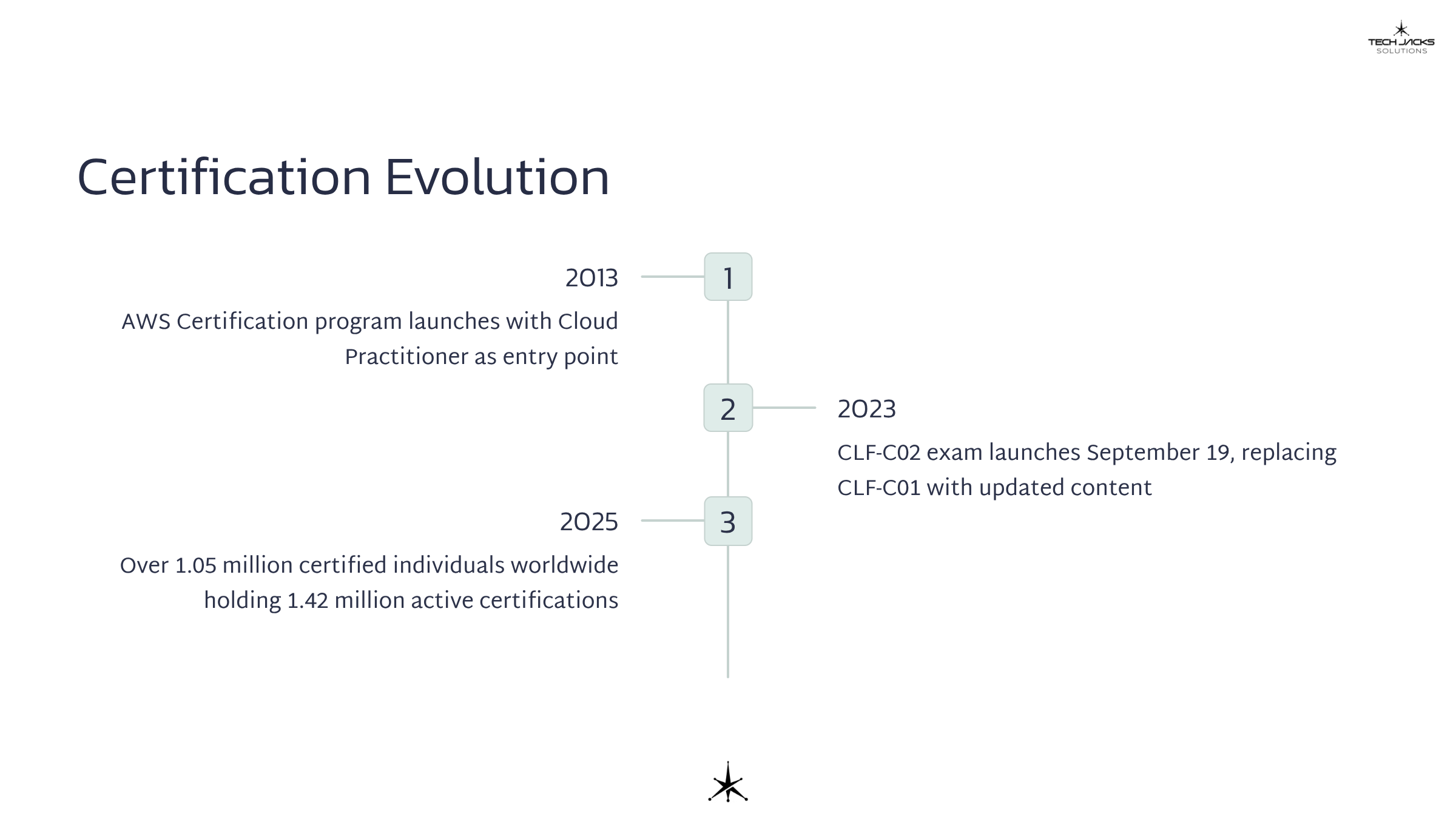 Certification Evolution: The credential launched around 2013 as part of AWS’s comprehensive certification program. The current exam version, CLF-C02, launched on September 19, 2023, replacing CLF-C01. This wasn’t merely a content refresh; it represented a strategic realignment reflecting key industry shifts.