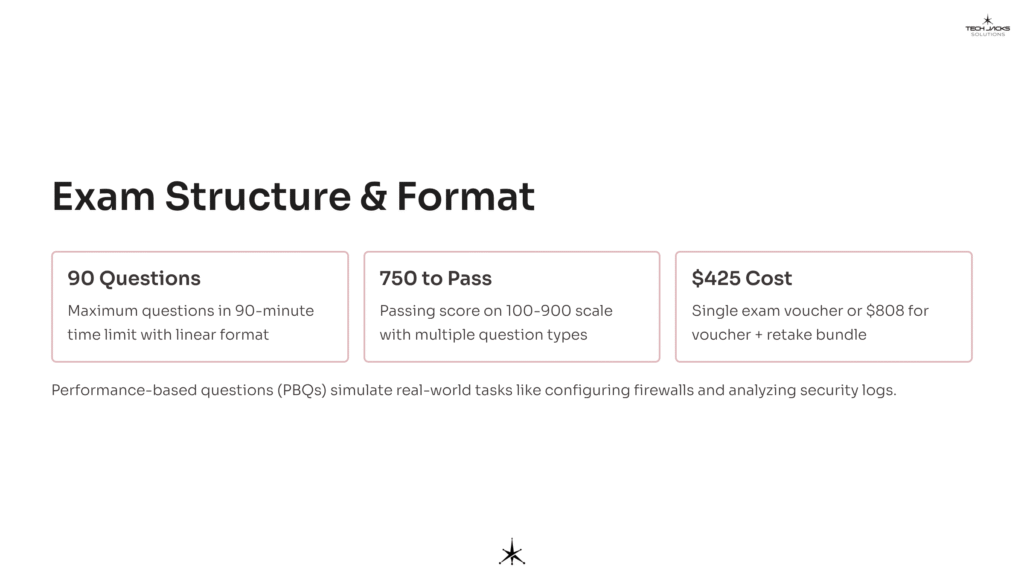 Exam Costs present straightforward pricing. A single exam voucher costs $425 USD according to CompTIA’s official marketplace. CompTIA offers a “Voucher + Retake” bundle for $808 USD, providing a second attempt at reduced cost compared to purchasing two separate vouchers.