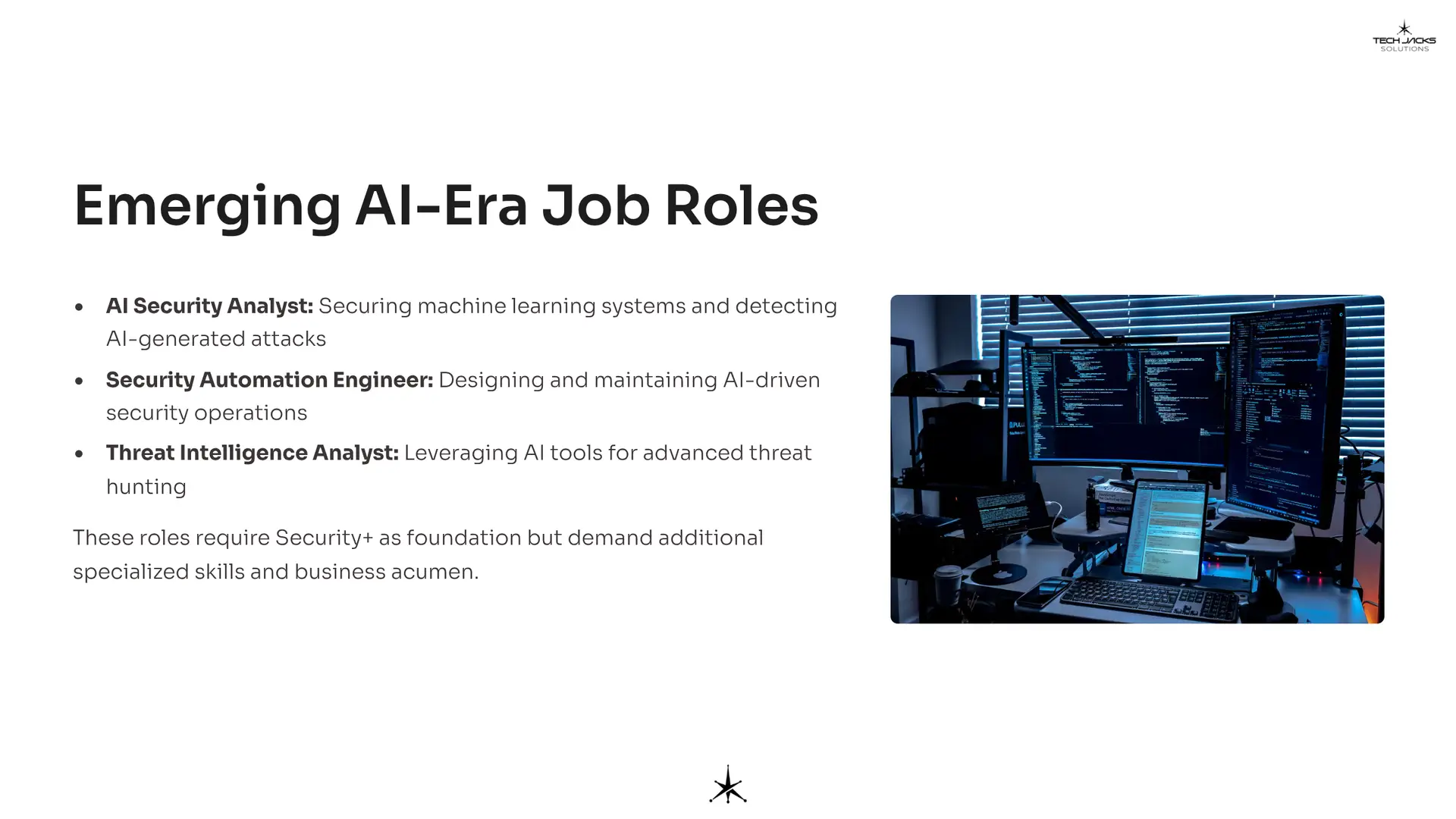 Emerging Job Roles blend traditional security knowledge with AI expertise, but they require higher skill levels than traditional entry positions. AI Security Analyst positions focus on securing machine learning systems and detecting AI-generated attacks. Security Automation Engineers design and maintain AI-driven security operations. Threat Intelligence Analysts leverage AI tools for advanced threat hunting and predictive analysis. These roles typically require Security+ as a foundation but demand additional specialized skills and business acumen.