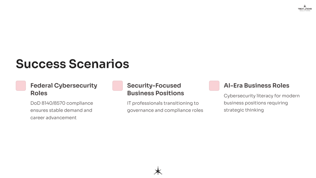 Realistic Success Scenarios include professionals seeking federal cybersecurity roles, IT professionals transitioning to security-focused business positions, and individuals developing cybersecurity literacy for AI-era business roles. Security+ provides maximum value when combined with specialized knowledge in governance, risk management, compliance, or emerging technology areas like AI security and cloud governance.