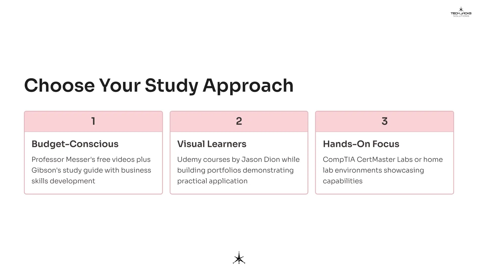 Step 2: Choose Study Approach and Career Positioning based on learning preferences, budget, and market goals. Budget-conscious learners can succeed with Professor Messer’s free videos plus Gibson’s study guide, but should supplement with business skills development. Visual learners benefit from Udemy courses by Jason Dion or Andrew Ramdayal while building portfolios that demonstrate practical application. Hands-on learners should prioritize lab access through CompTIA CertMaster Labs or building home lab environments that showcase capabilities to potential employers.