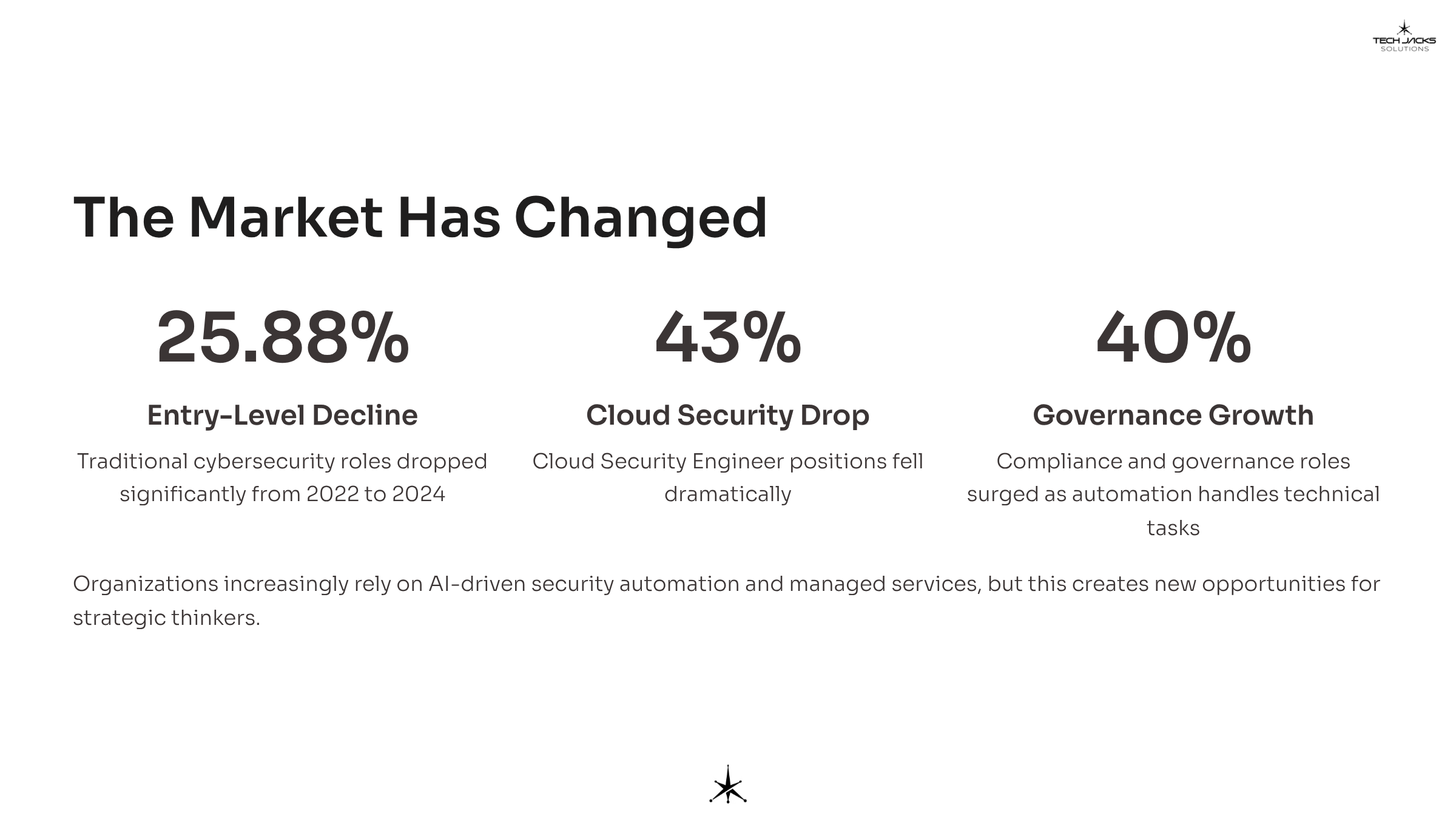 But this transformation creates new opportunities for those who understand the evolving landscape. While routine SOC monitoring gets automated, governance and compliance roles surged 40%. The U.S. government still mandates Security+ for cybersecurity roles through DoD 8140/8570 requirements, creating stable demand that transcends market trends.
