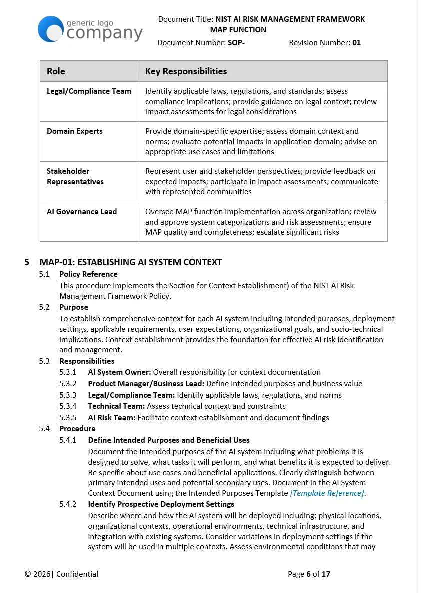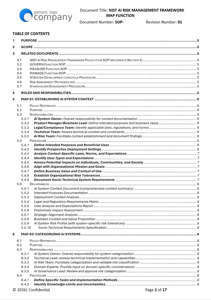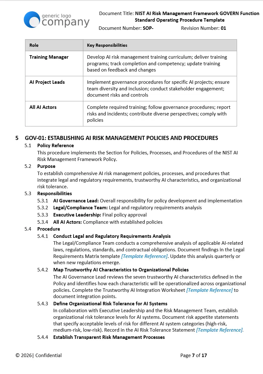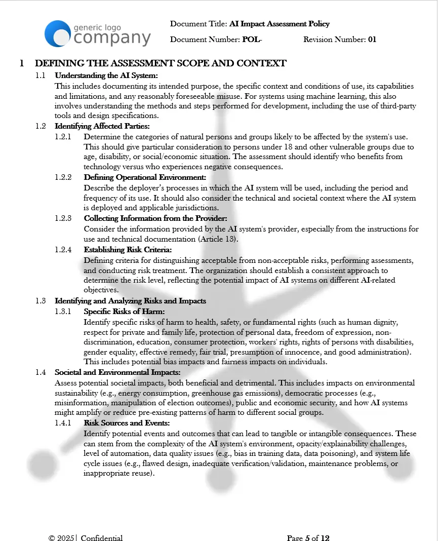 They’re written to align with widely referenced standards for AI governance, including the EU AI Act, NIST AI Risk Management Framework (AI RMF), ISO/IEC 42001 (AI management system), ISO/IEC 23894 (AI risk management), and ISO/IEC 27001 for information security. Alignment language is provided in each template so you can map controls to your internal program.