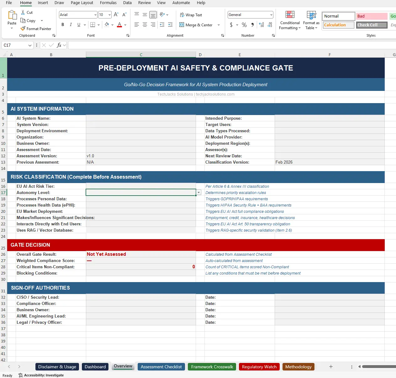 Light guidance is included in each template (notes, examples, and placeholders). For hands‑on customization or workshops, contact support@techjacksolutions.com for advisory rate.