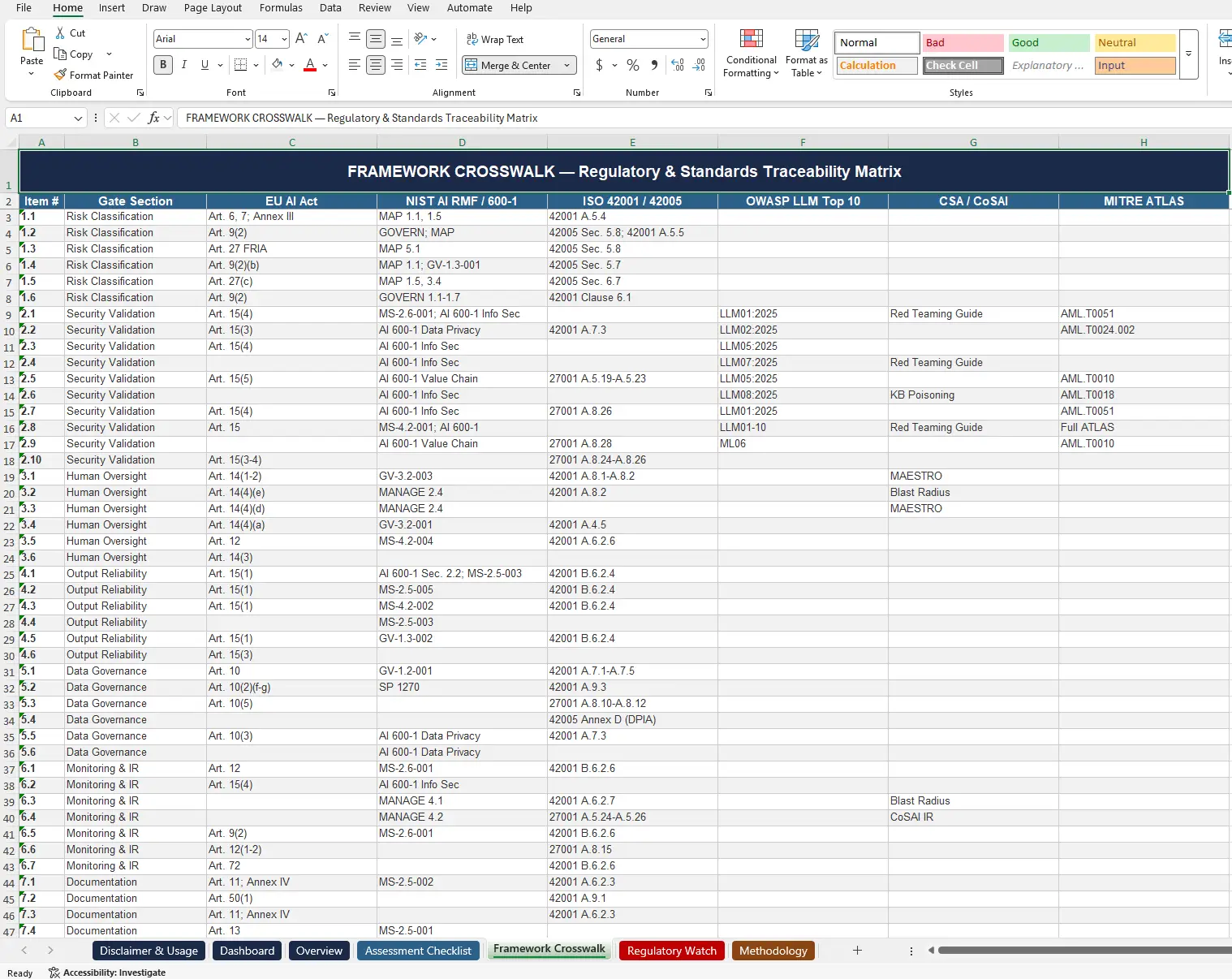 Aligned with NIST AI RMF, EU AI Act, ISO 27001, ISO 42001, and ISO 9001 QMS frameworks.