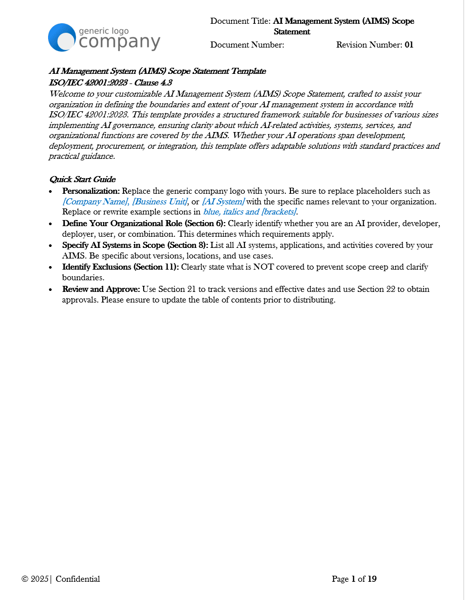 Q: Does this template guarantee ISO 42001 certification? A: No. This template provides documentation frameworks for one clause of ISO/IEC 42001:2023. Certification requires implementation of all applicable standard requirements, supporting policies and procedures, operational controls, and successful third-party audit. This template supports scope documentation but does not constitute a complete AIMS or guarantee certification outcomes.