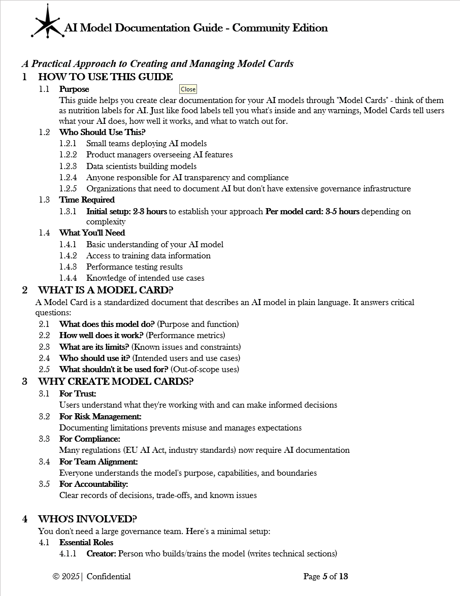 The guide includes templates, role definitions, and implementation steps designed to help teams create documentation without building extensive governance infrastructure first. Organizations can typically establish their documentation approach within 2-3 hours of initial setup, with 3-5 hours per Model Card depending on system complexity.
