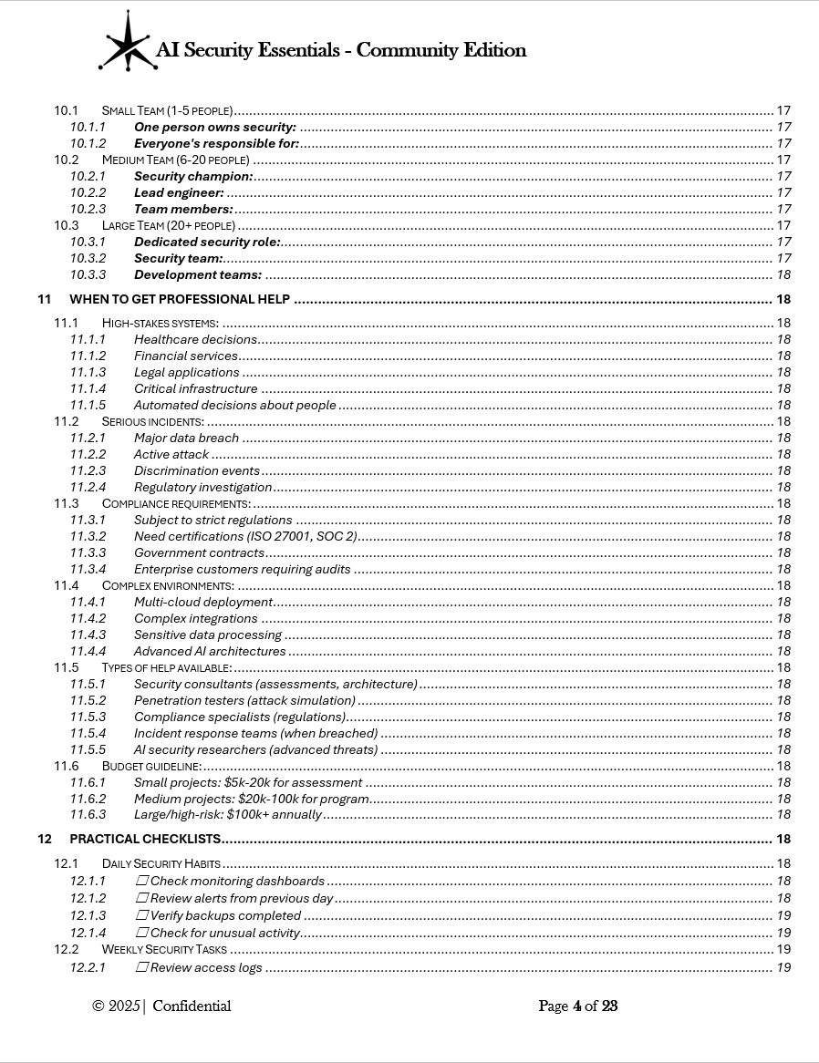 Q: When should we hire professional security help? A: Consider external help for high-stakes systems (healthcare, finance, legal, critical infrastructure), serious incidents (major breaches, active attacks, discrimination events), strict compliance requirements (certifications, government contracts), or complex environments (multi-cloud, sensitive data processing). Budget guidelines range from $5k-$20k for small project assessments to $100k+ annually for large high-risk systems.