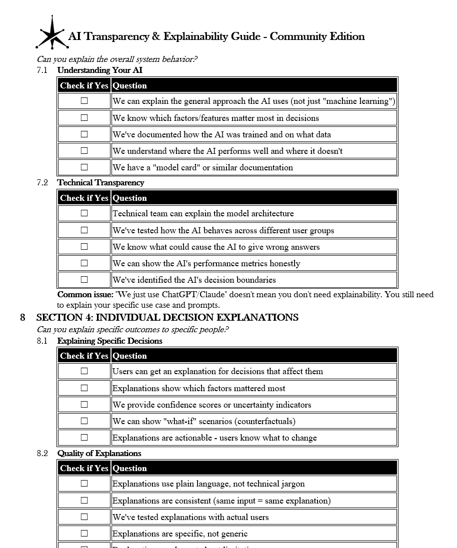 Preview What's Inside: The guide contains seven assessment sections with checkbox frameworks, a transparency scoring matrix, explanation technique recommendations, common mistake warnings, and action planning templates. Supporting sections provide regulatory context, resource recommendations, and documentation templates.