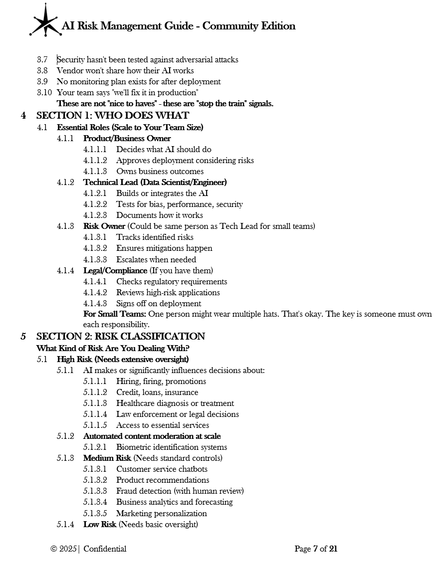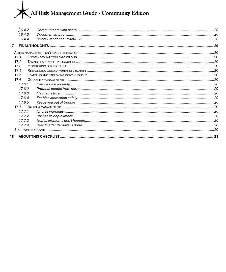 Q: Is this guide sufficient for regulatory compliance? A: This guide provides a risk management framework but does not guarantee compliance with specific regulations. Organizations should consult legal counsel regarding applicable requirements in their jurisdiction. The guide references common AI governance principles but does not provide legal advice.