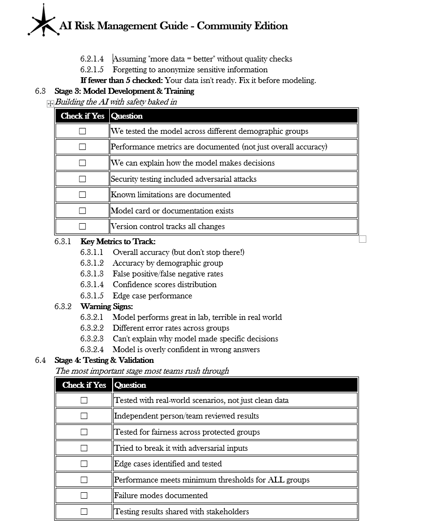 ✓ Includes practical tools such as risk registers, model cards, testing checklists, and incident logs