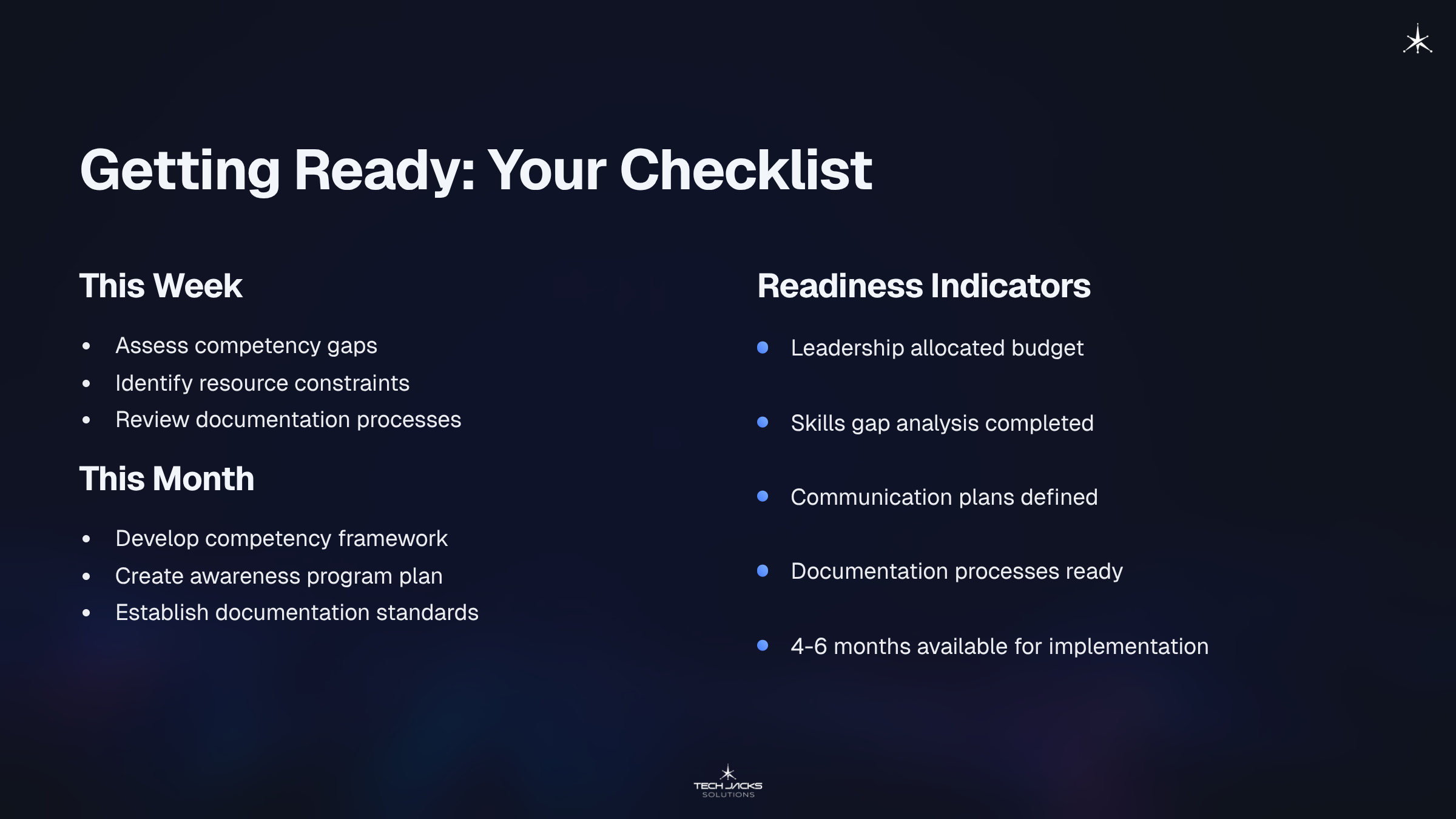 Build Competency: Start with skills gap analysis. Combine technical and governance training. Verify through assessments.