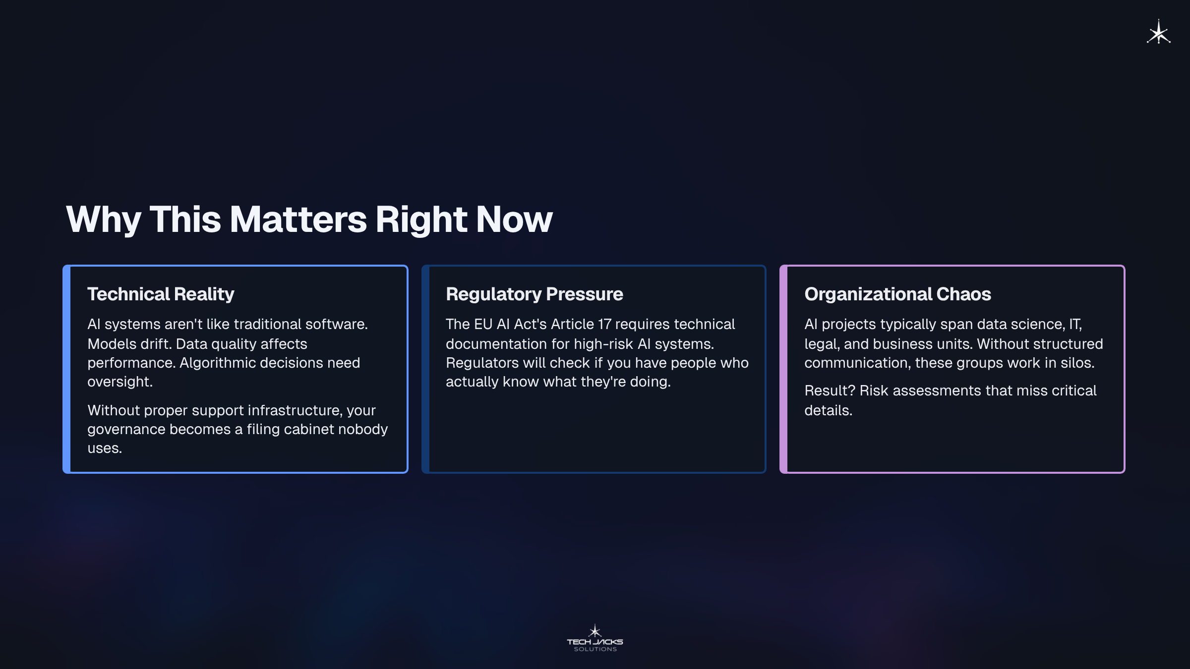 Technical Reality: AI systems aren’t like traditional software. Models drift. Data quality affects performance. Algorithmic decisions need oversight. Without proper support infrastructure, your governance becomes a filing cabinet nobody uses.