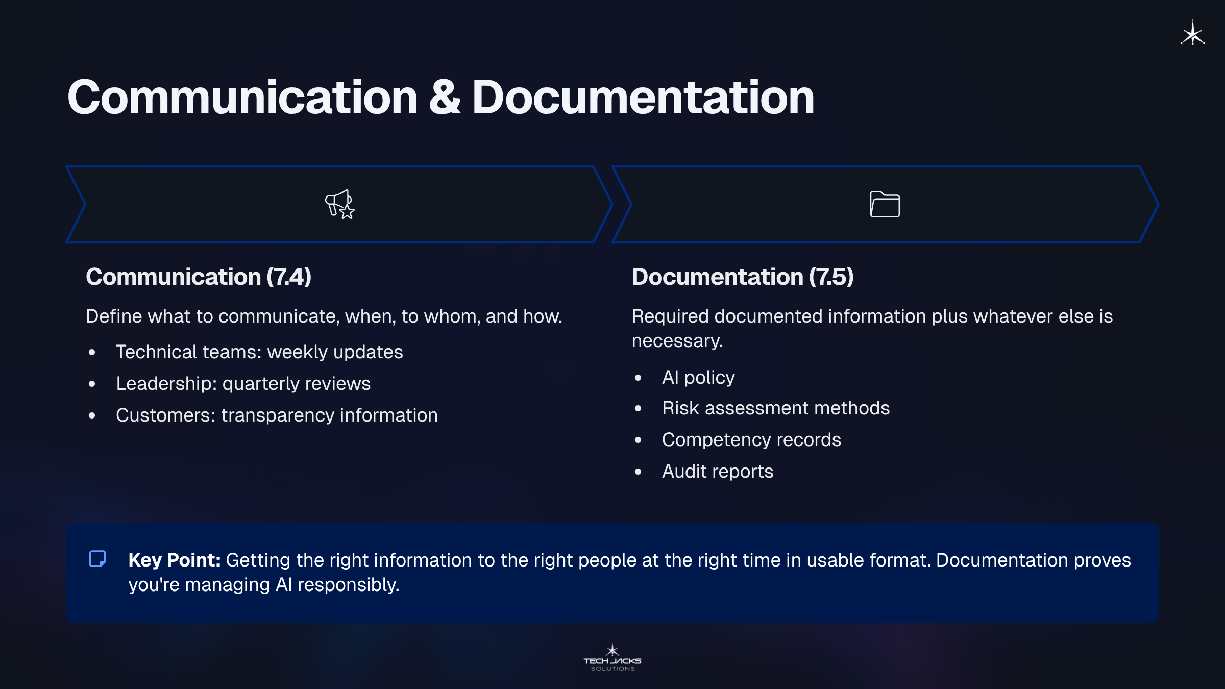 Key docs: AI policy, risk assessment methods, risk treatment plans, competency records, audit reports. Documentation guides people and proves to auditors you’re managing AI responsibly.